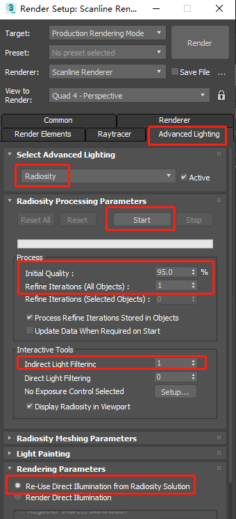 在渲染参数中选择 重新使用光能传递解决方案的直接照明(re-use direct illumination from radiosity solution)
