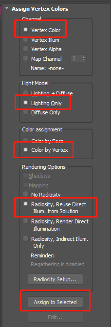 设置通道为 Vertex Color,光照类型为 Lighting Only,颜色分配为 Color by Vertex,渲染选项选Radiosity,Reuse Direct Illum ,from Solution。